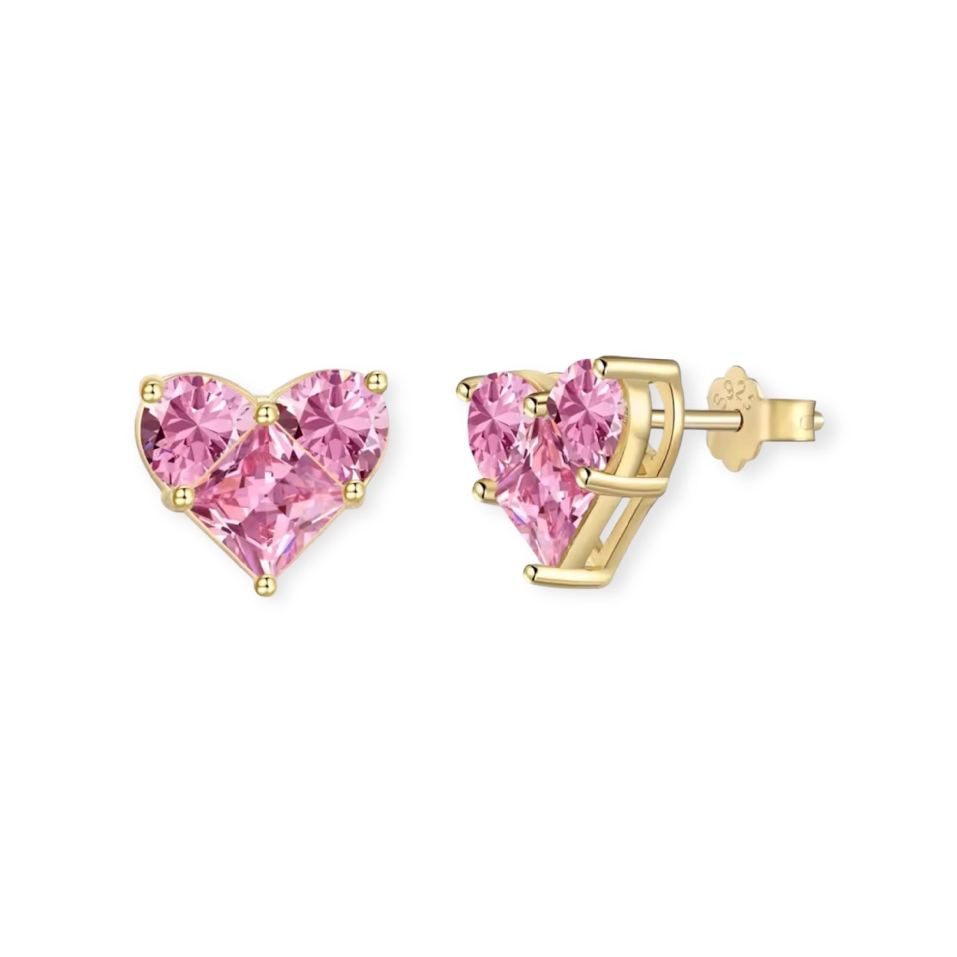 Crafted with precision, each earring features a radiant pink heart-cut stone that sparkles with every movement, framed in a delicate, high-polish setting.